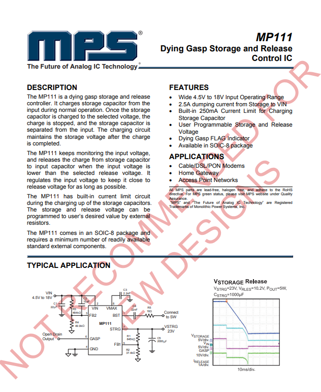 The MP111 is a dying gasp storage and release controller. It charges storage capacitor from the input during normal operation. Once the storage capacitor is charged to the selected voltage, the charge is stopped, and the storage capacitor is separated from the input. The charging circuit maintains the storage voltage after the charge is completed.